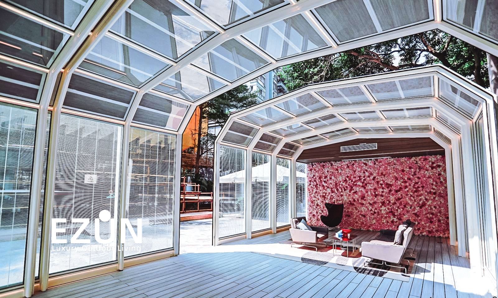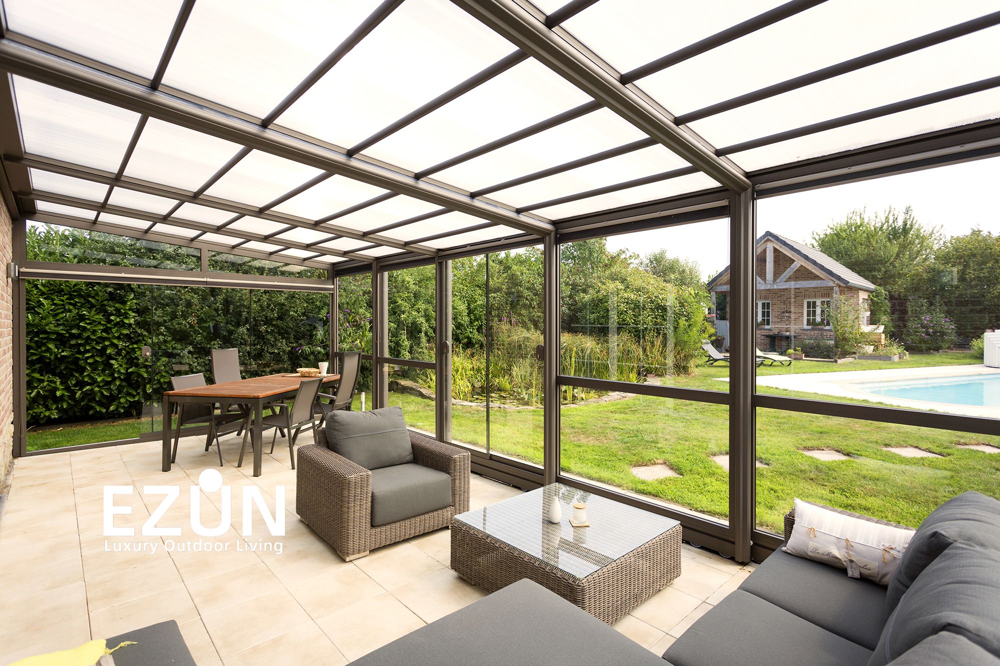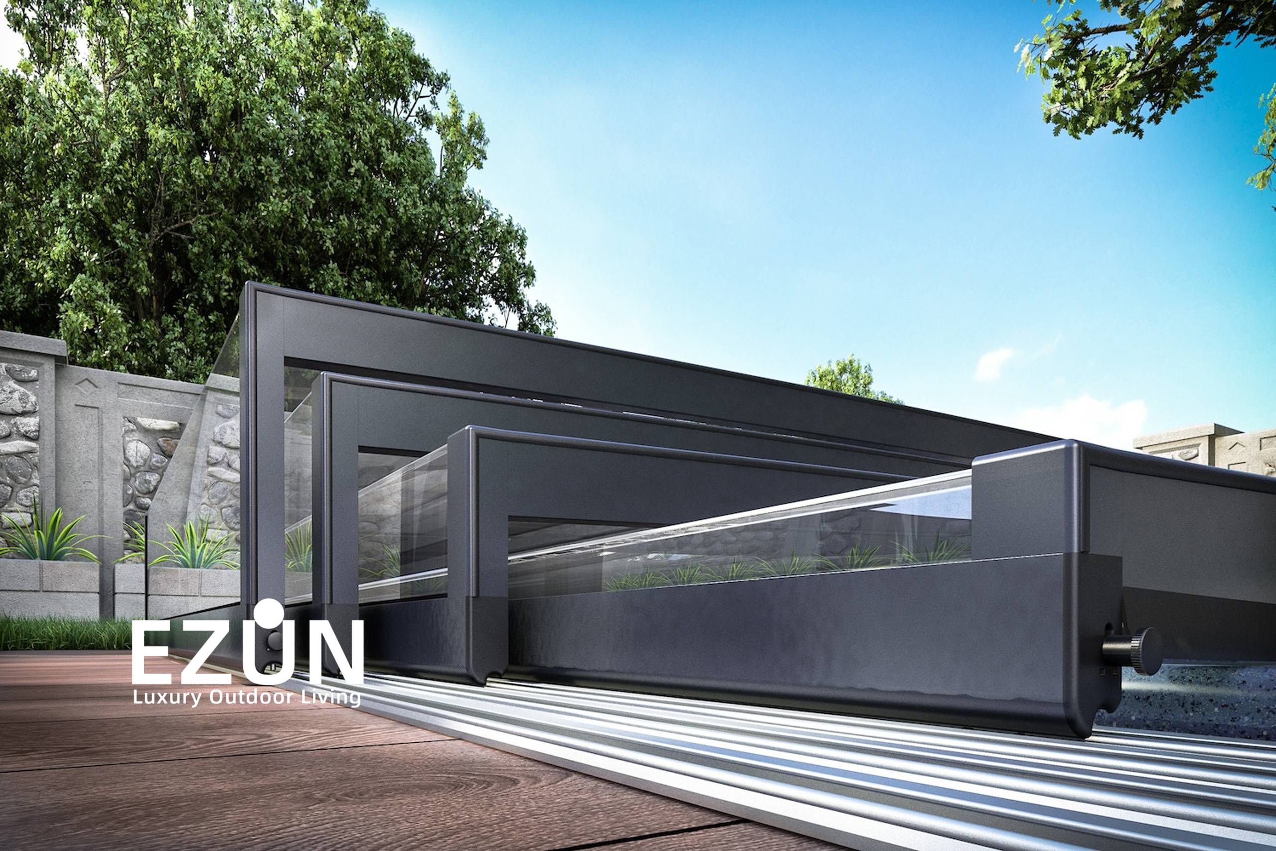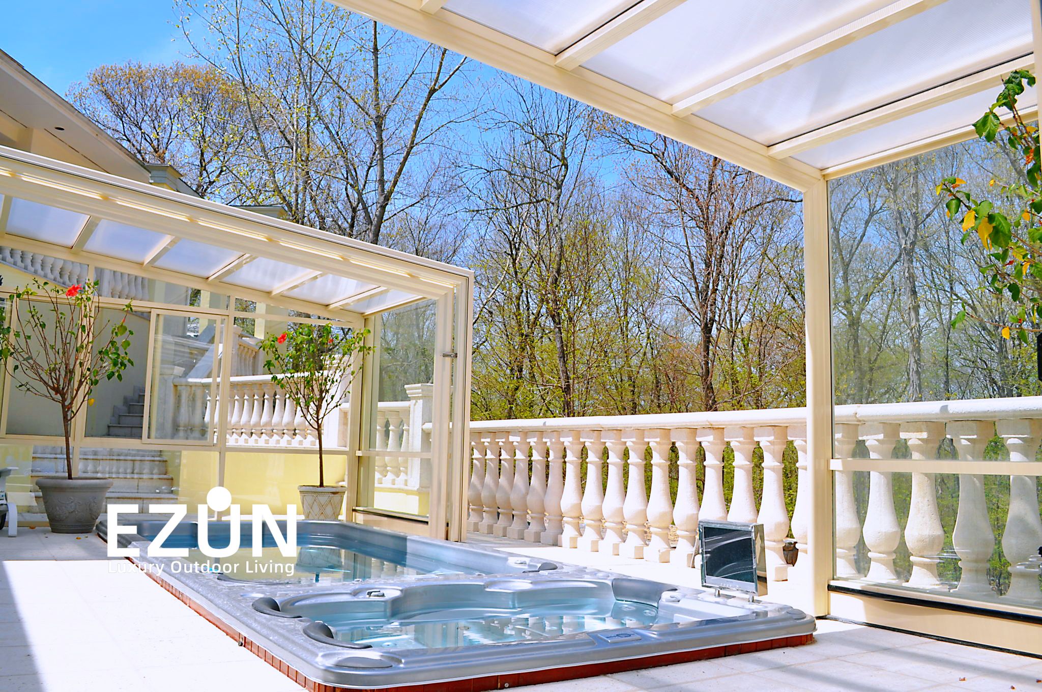 易尊移动阳光房框架模块化滑轨设计,内置安装电机,能够通过电动遥控随意控制阳光房的开合,自动伸缩,灵活调节阳光板的覆盖面积。选用铝合金6061-T6系列,硬度系数13以上,面板可选用夹胶玻璃或聚碳酸酯板材。可以从规格,款式,色彩提供多种方案。并根据需求和场地进行优化设计。为您定制专属产品。