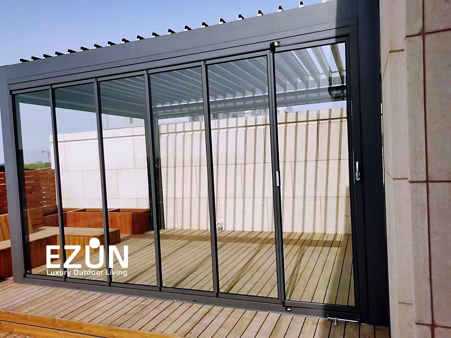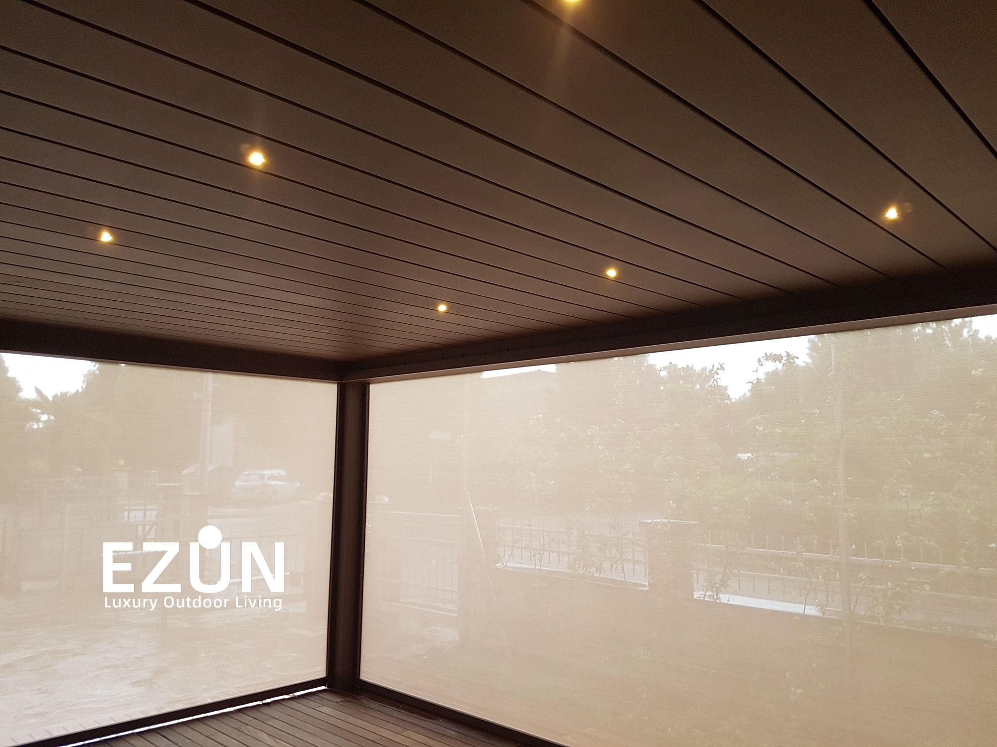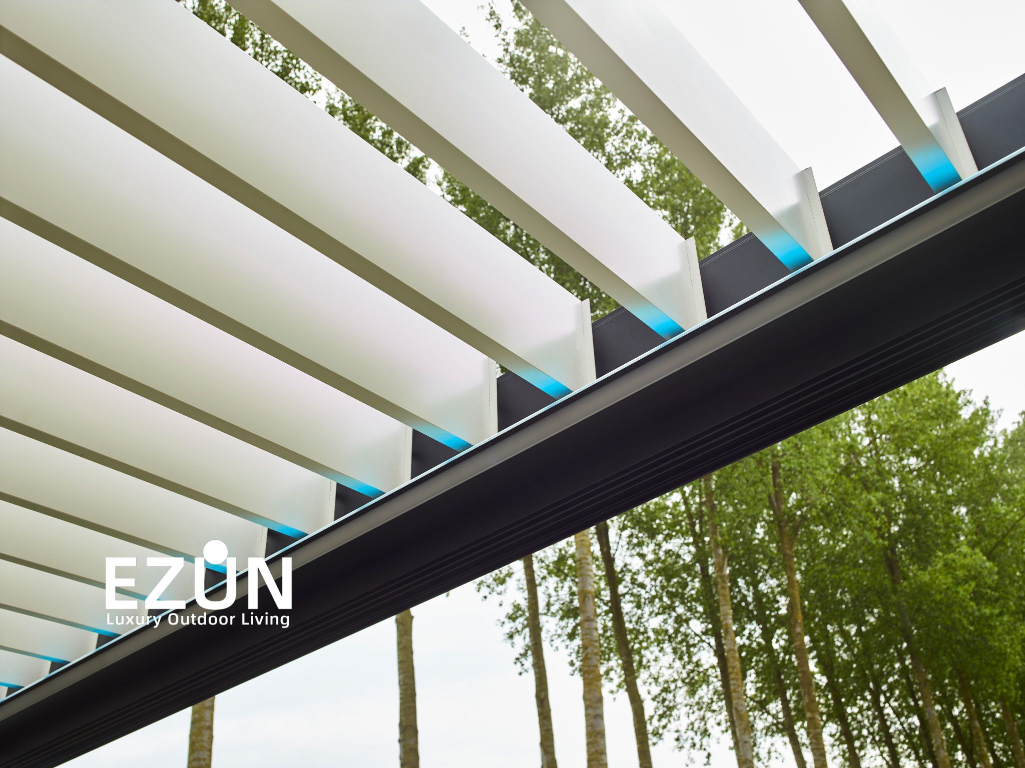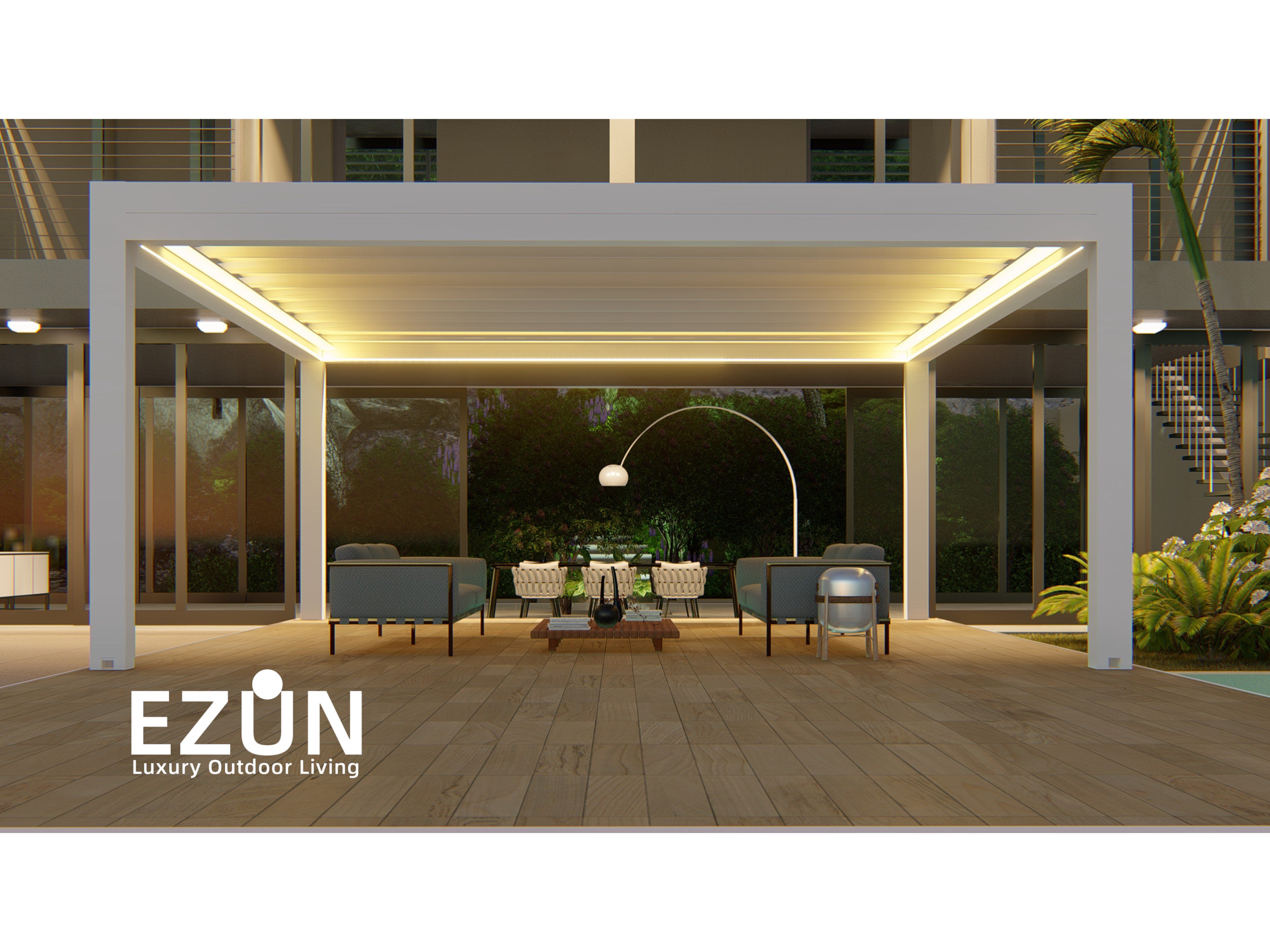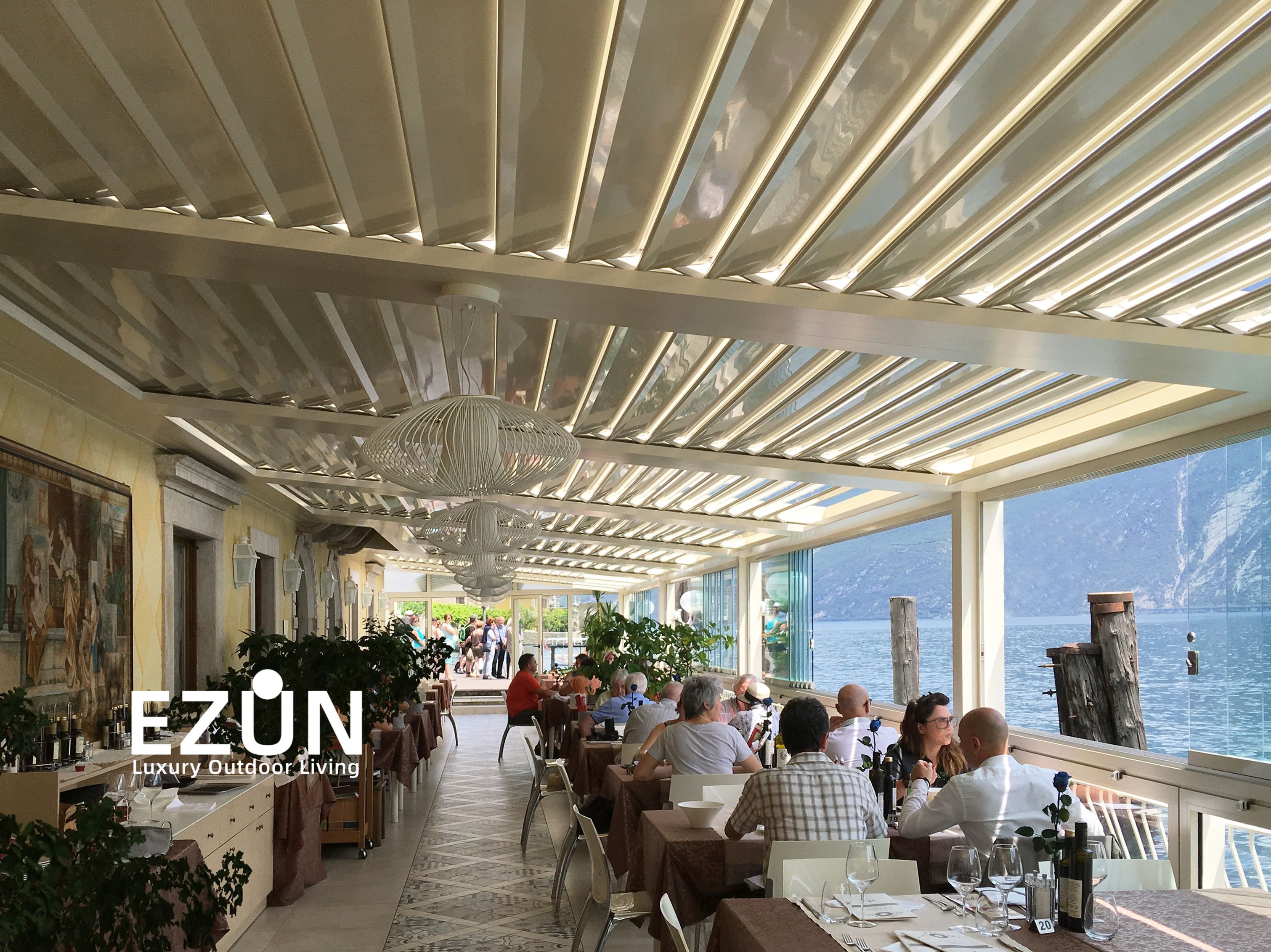 易尊百叶凉亭是采用全铝合金制造,契合多种形态转换的建筑艺术品。当叶片打开,阳光和微风可从指定角度进入,通过控制叶片不同的角度来调节阳光的强弱和温度的大小。当叶片闭合后,则完全阻挡阳光和雨水,雨水能顺着既定的排水槽流走。坚固的铝合金材质能抵御恶劣气候及环境,使用寿命可达20年。