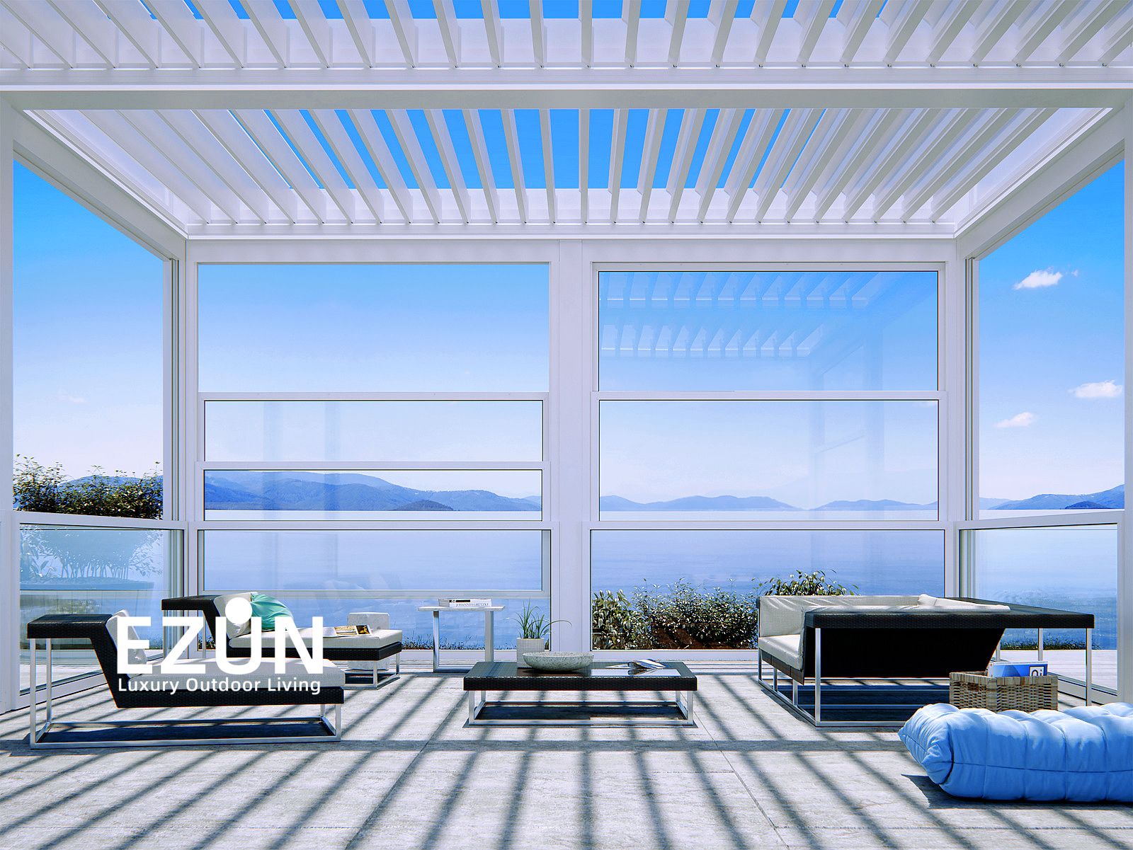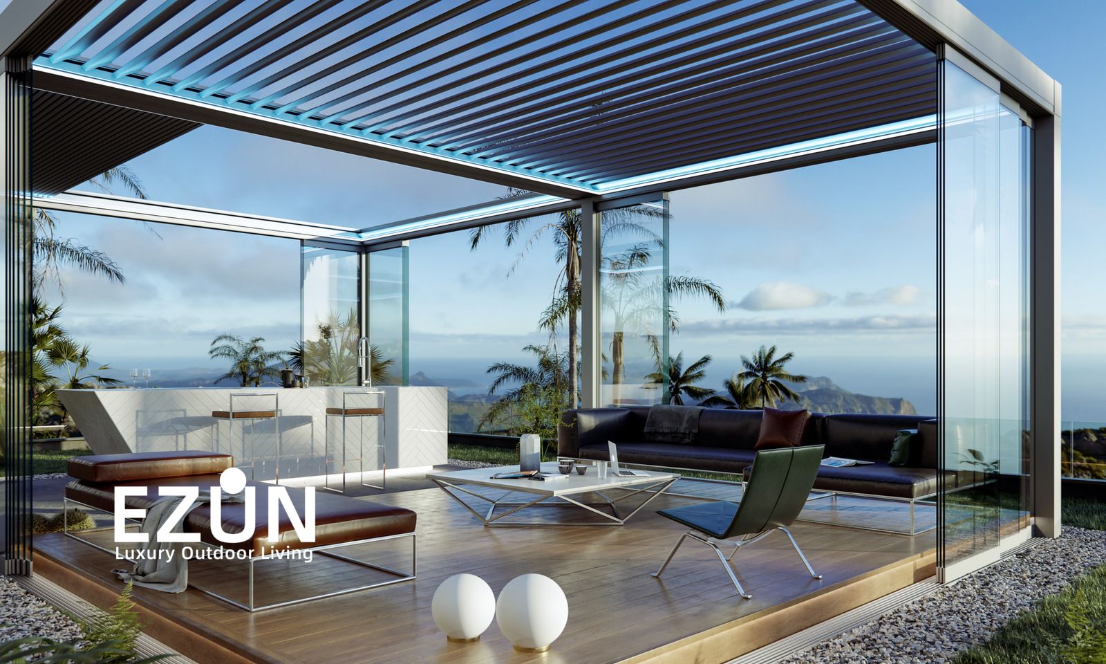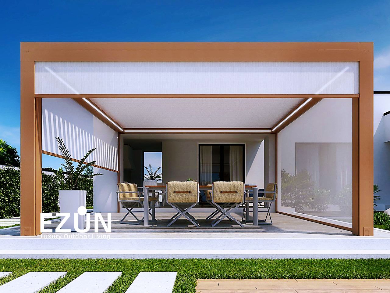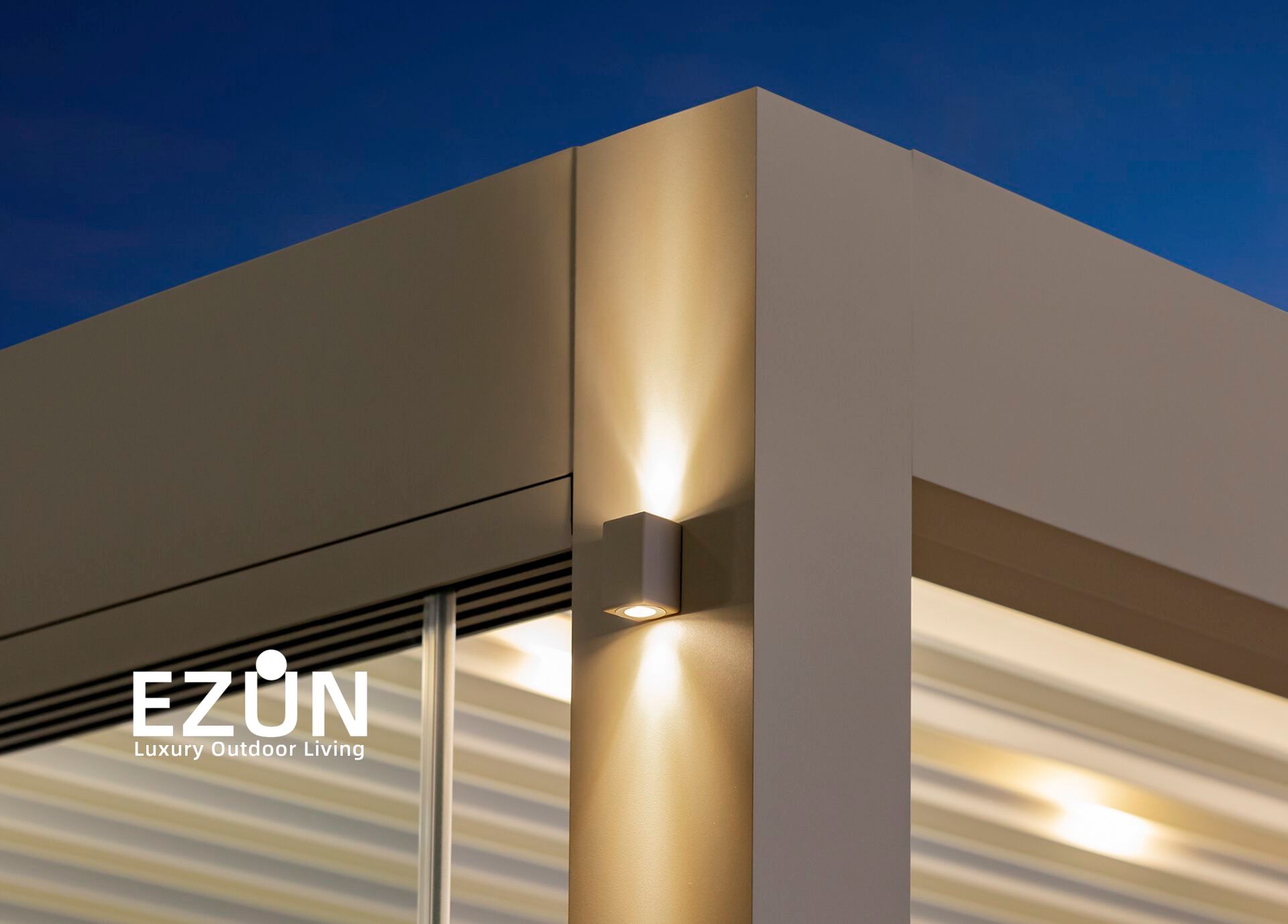 易尊百叶凉亭是采用全铝合金制造,契合多种形态转换的建筑艺术品。当叶片打开,阳光和微风可从指定角度进入,通过控制叶片不同的角度来调节阳光的强弱和温度的大小。当叶片闭合后,则完全阻挡阳光和雨水,雨水能顺着既定的排水槽流走。坚固的铝合金材质能抵御恶劣气候及环境,使用寿命可达20年。