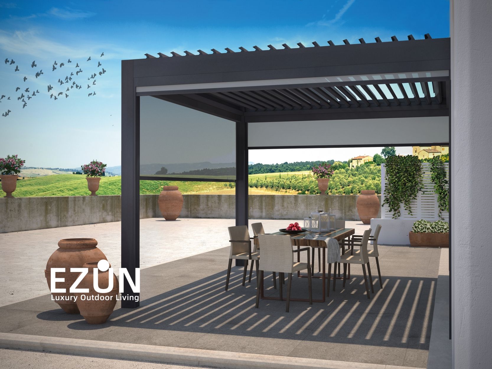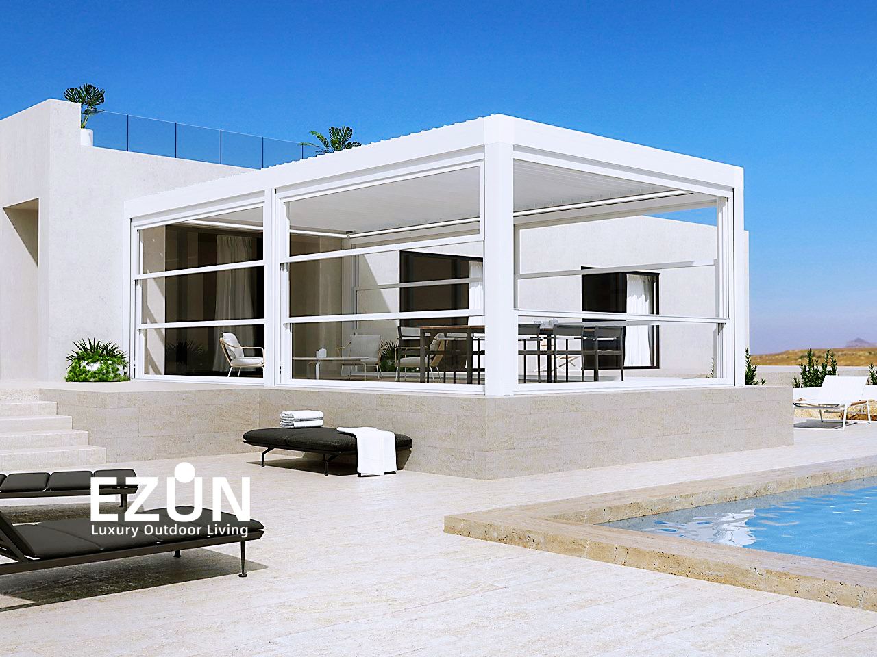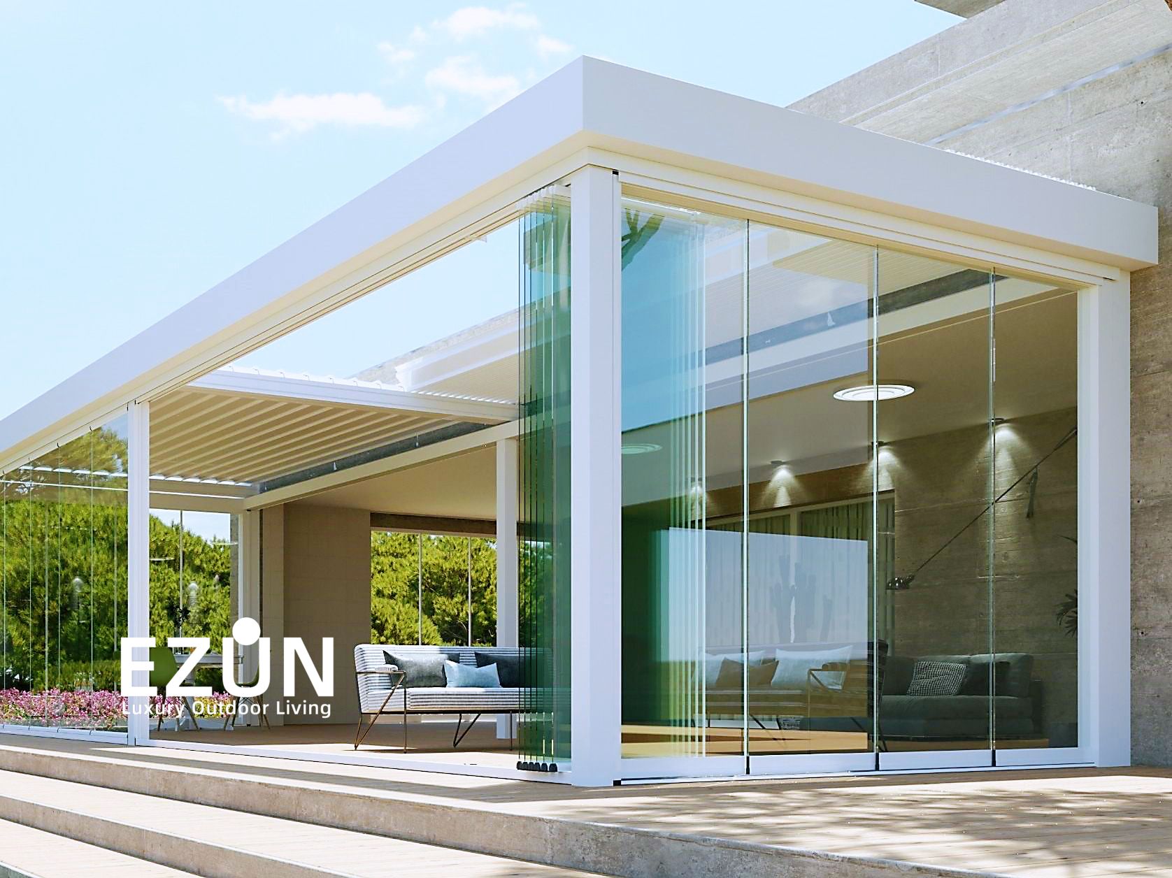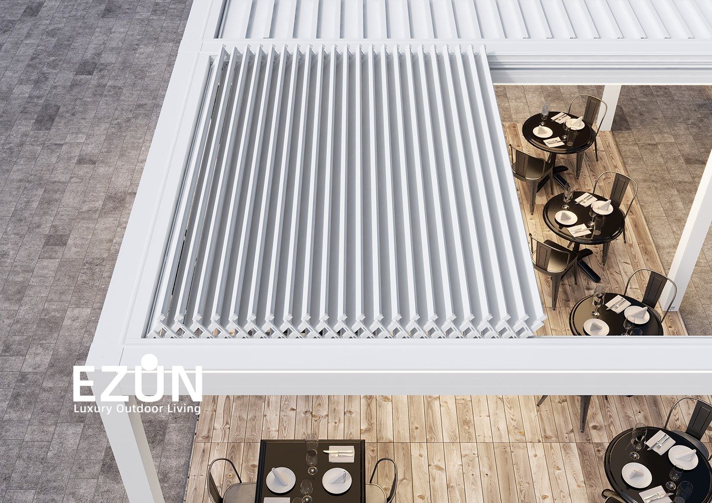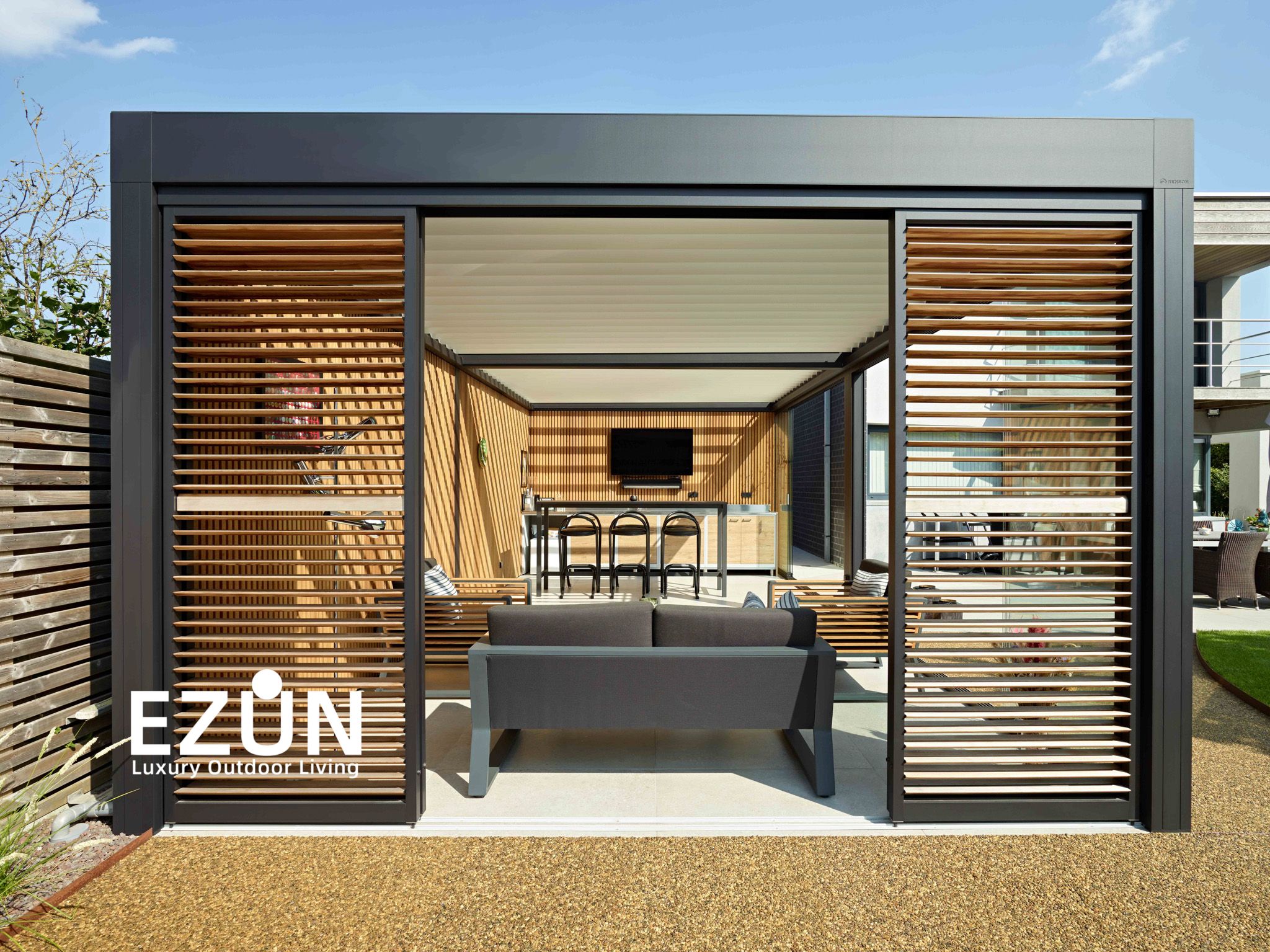 易尊百叶凉亭是采用全铝合金制造,契合多种形态转换的建筑艺术品。当叶片打开,阳光和微风可从指定角度进入,通过控制叶片不同的角度来调节阳光的强弱和温度的大小。当叶片闭合后,则完全阻挡阳光和雨水,雨水能顺着既定的排水槽流走。坚固的铝合金材质能抵御恶劣气候及环境,使用寿命可达20年。