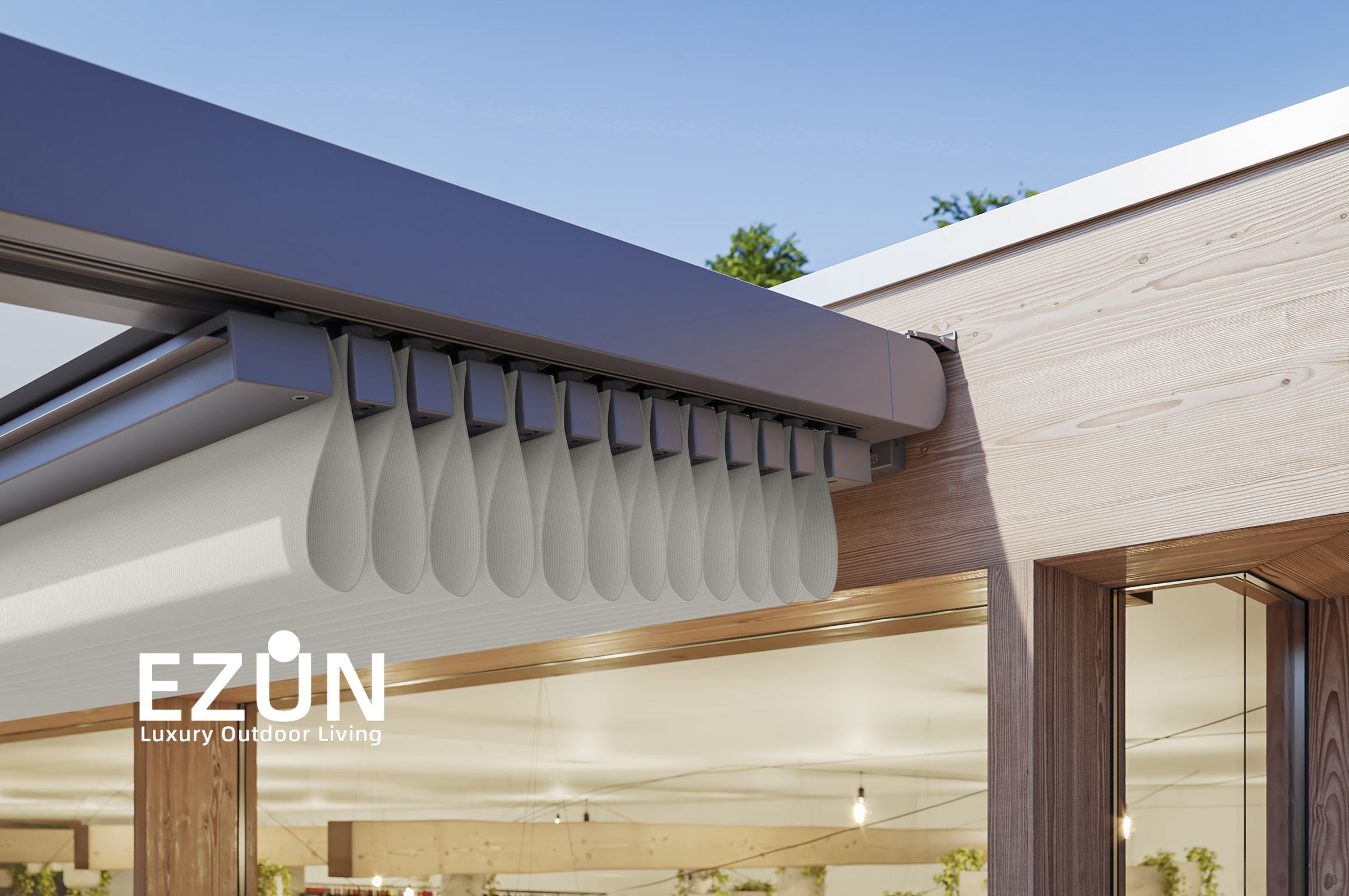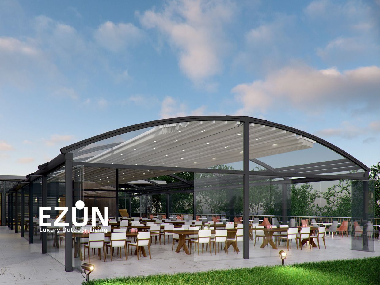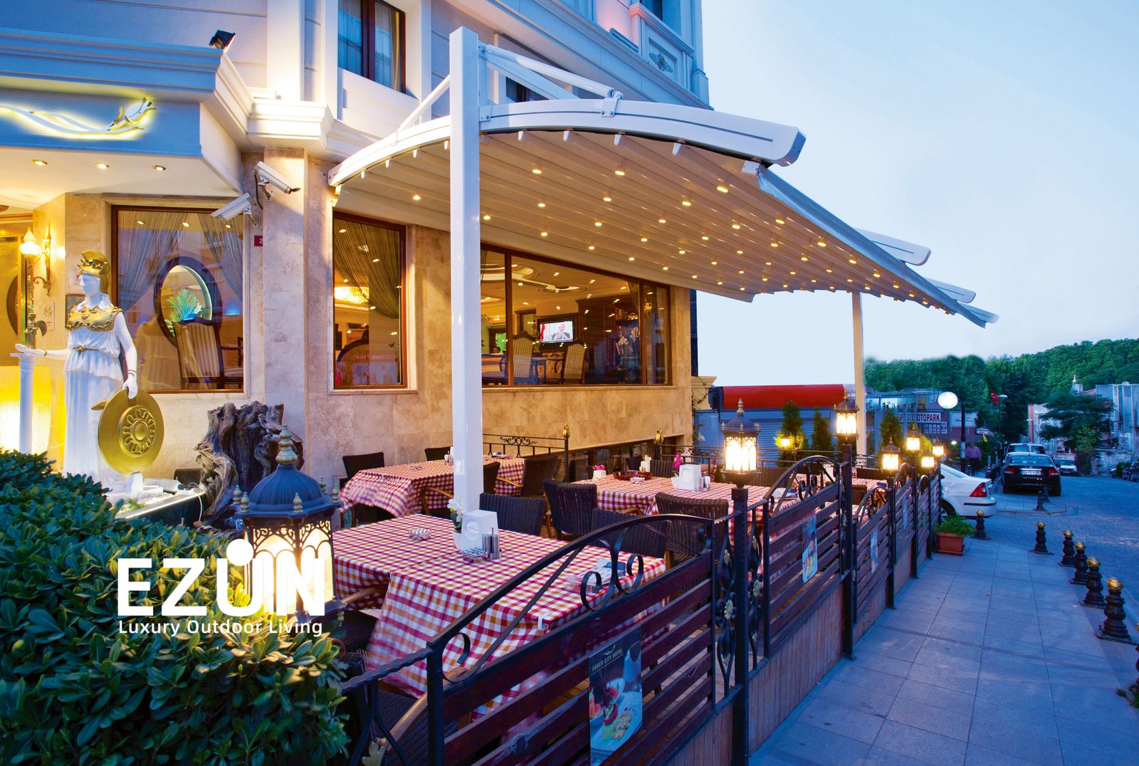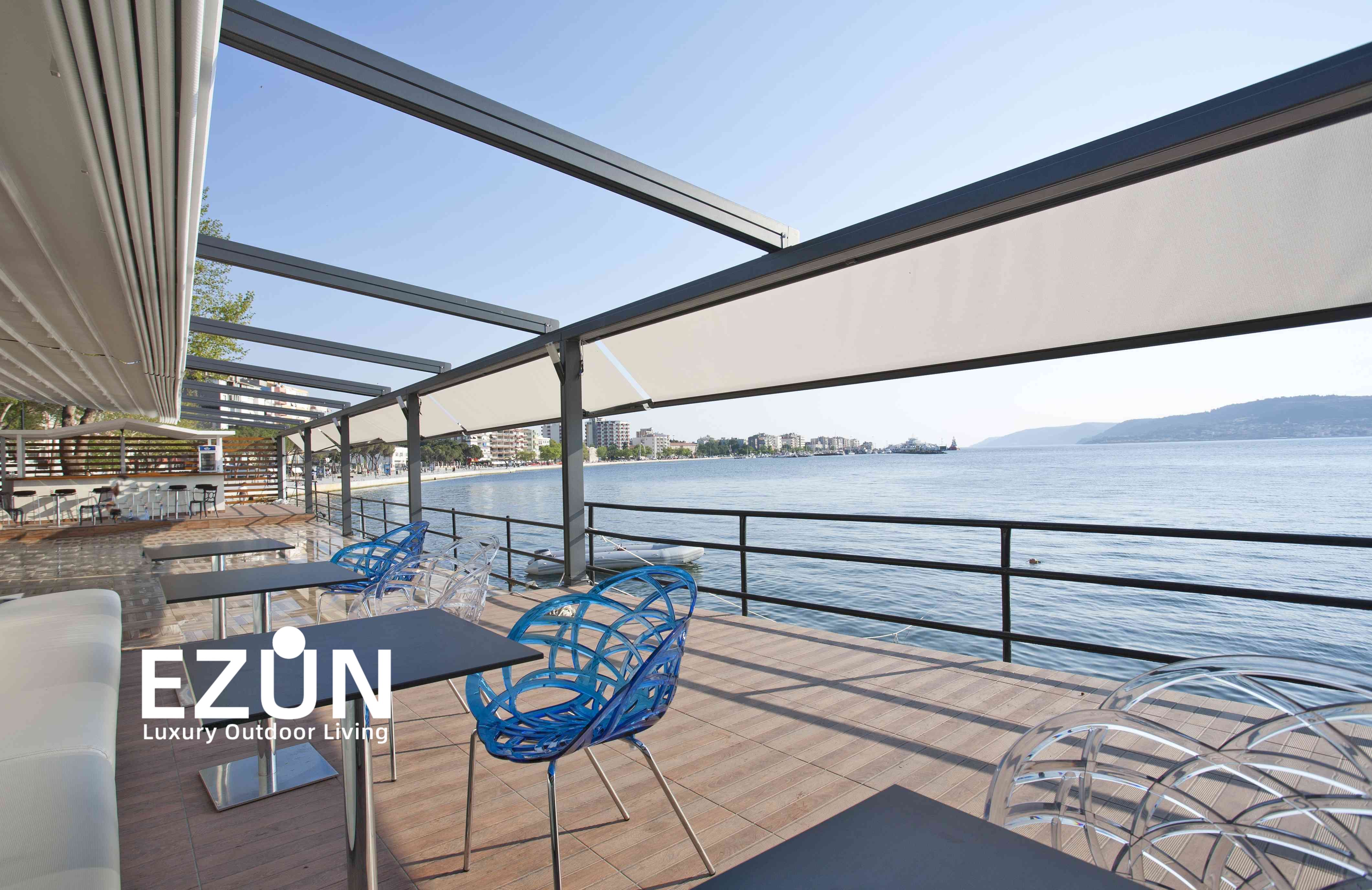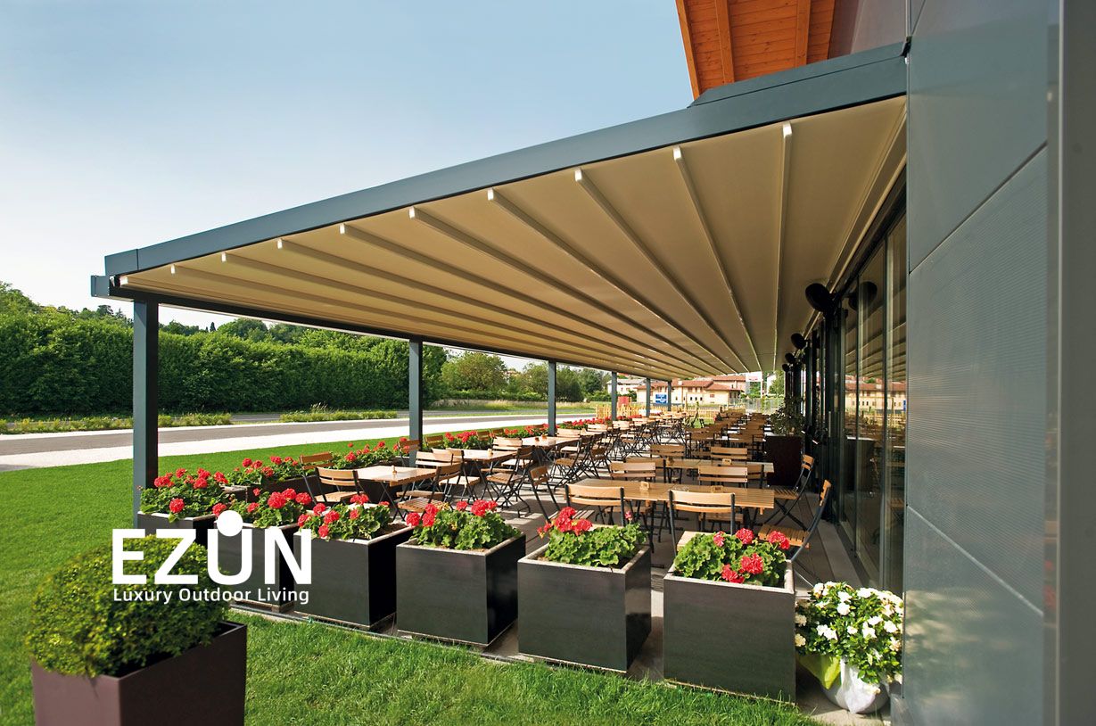 折叠天幕是一种最受青睐的户外空间拓展方案。布料通过特制的电机随铝制轨道伸缩移动,打开时可让客户感受大自然的阳光与空气,闭合后可以100%防水并抗风。轨道的设计可以延伸尺寸,大面积覆盖空间。