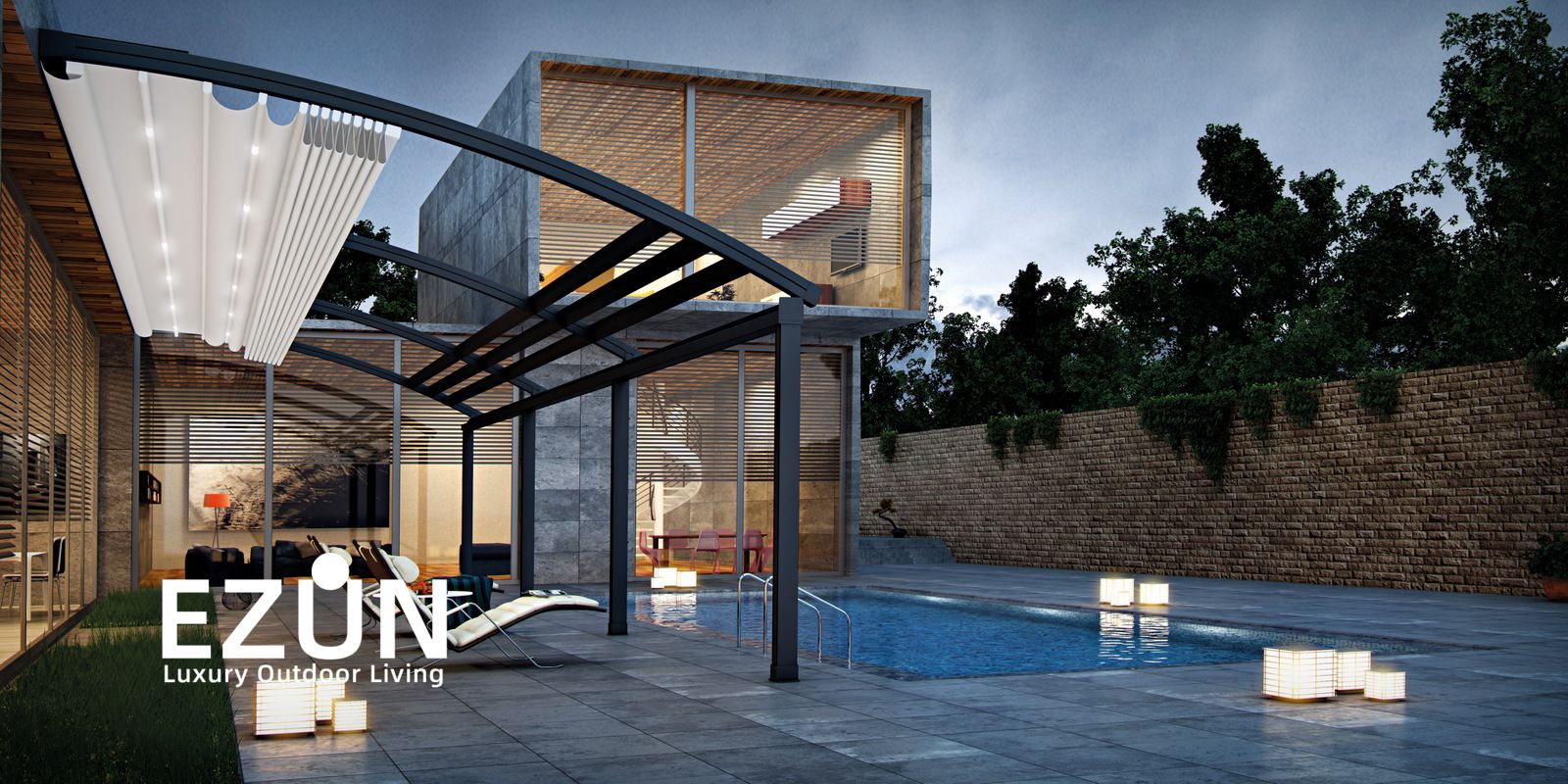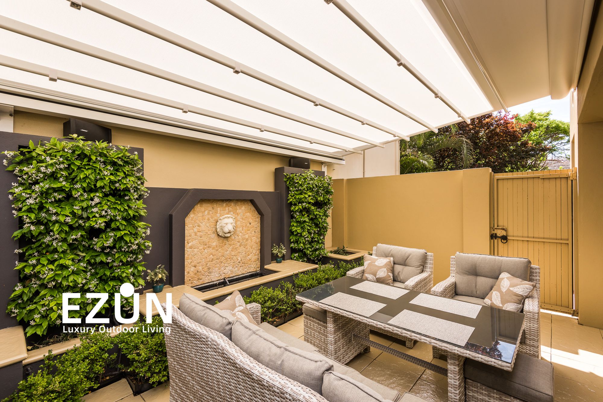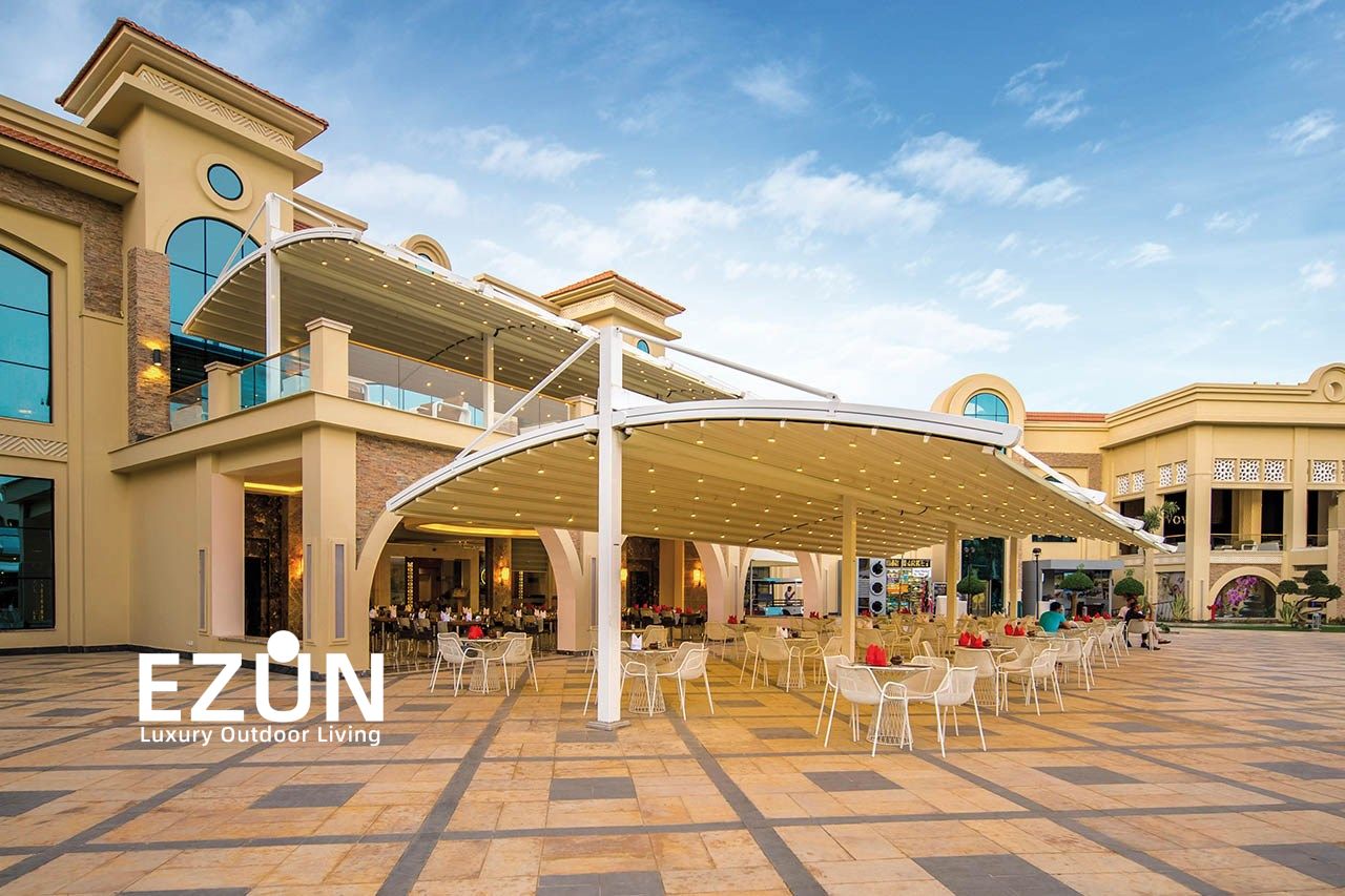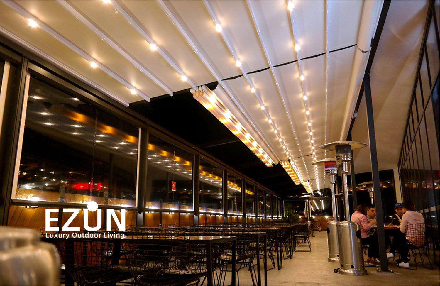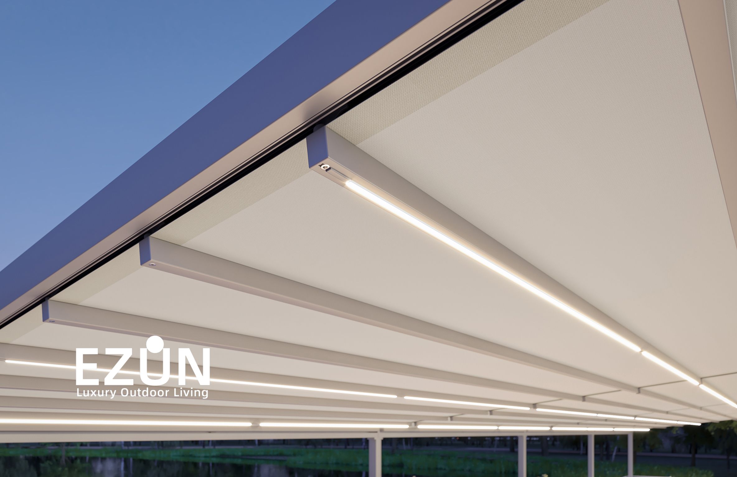 折叠天幕是一种最受青睐的户外空间拓展方案。布料通过特制的电机随铝制轨道伸缩移动,打开时可让客户感受大自然的阳光与空气,闭合后可以100%防水并抗风。轨道的设计可以延伸尺寸,大面积覆盖空间。